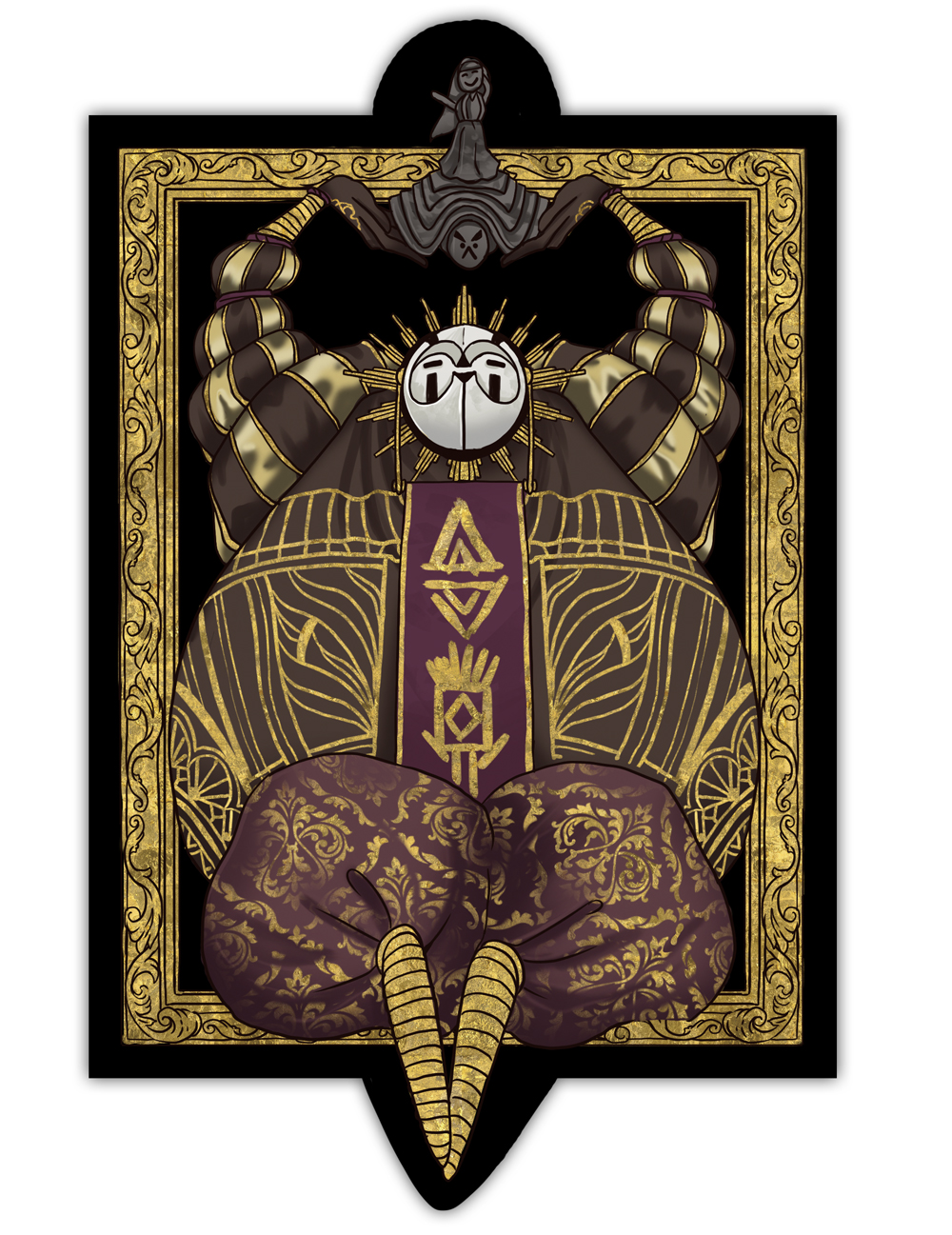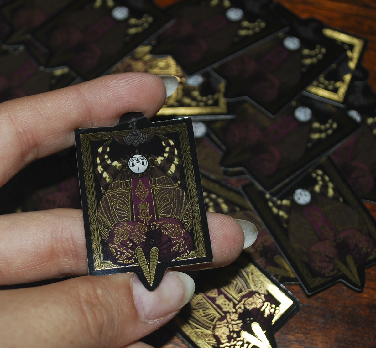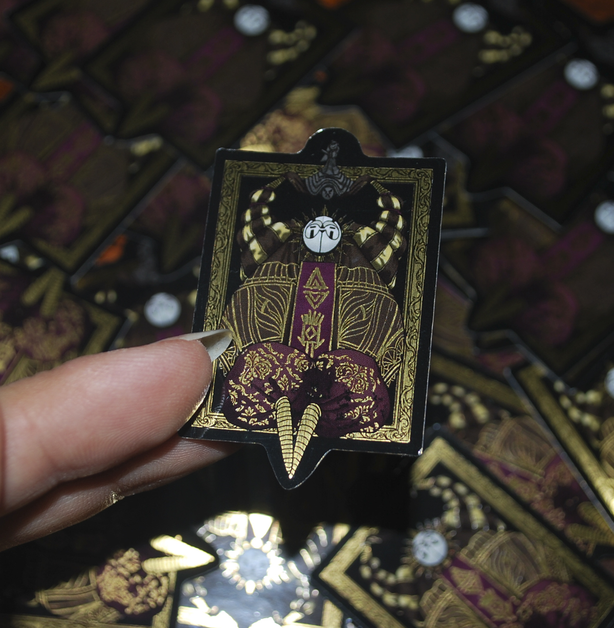 Sticker petit format à détails dorés. Esquie, le compagnon d’aventure de l’expédition 33, tenant la sculpture de Cléa et François qu’il offre à ce dernier en toute fin du jeu Clair Obscur .